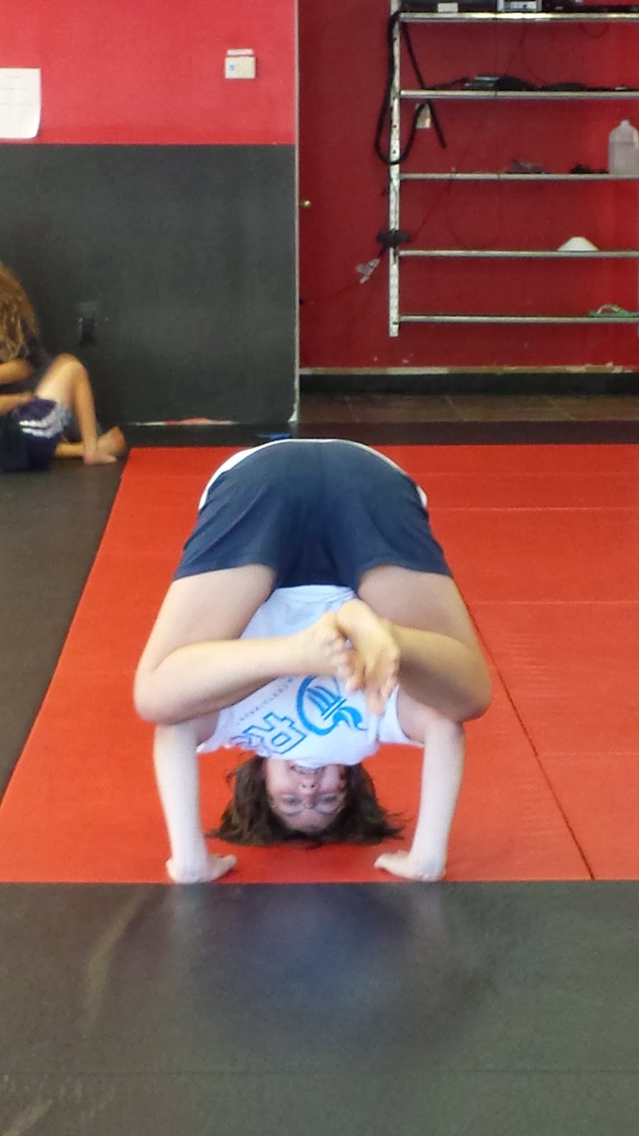 So my not so little munchkin went to her first Brazilian Jiu Jitsu class. I wasn't sure what to expect but it was great and she really enjoyed it. The first instructor that worked with her was T.J. We got there early and he worked with her on some rolls and other things that they would be doing in class, just to get her comfortable. Mondays and Fridays they have strength training so she didn't need a Gi.